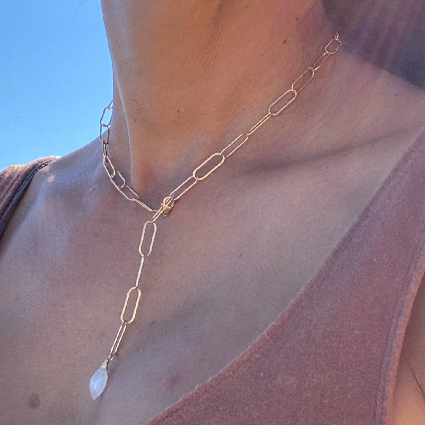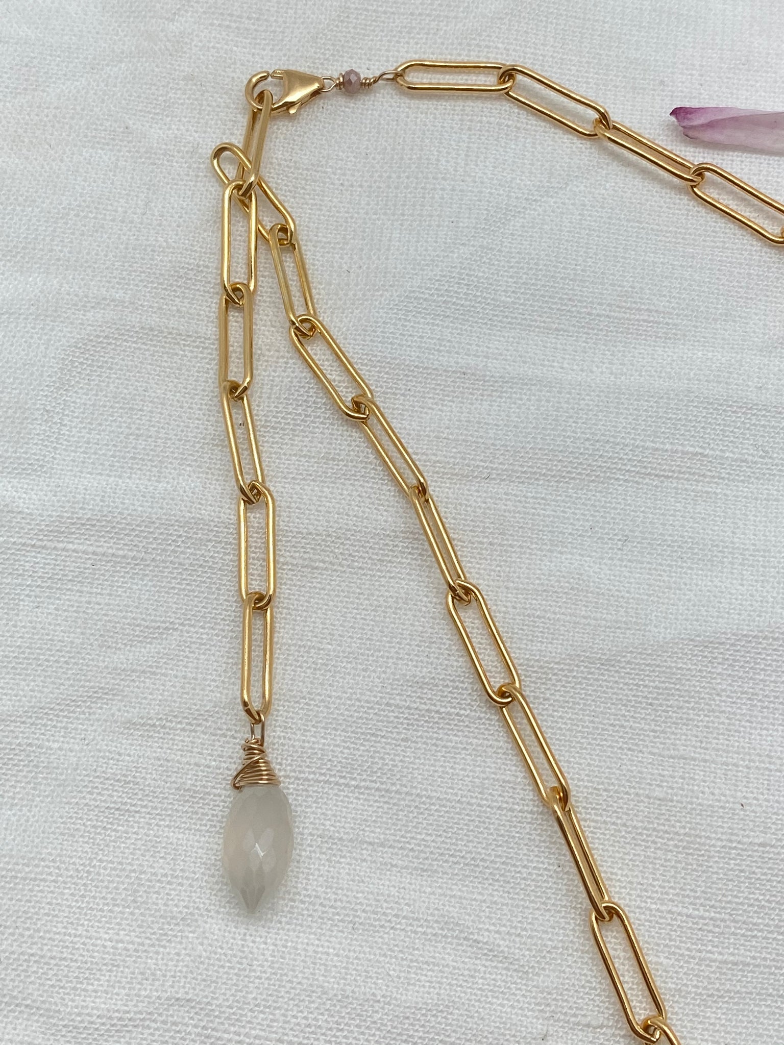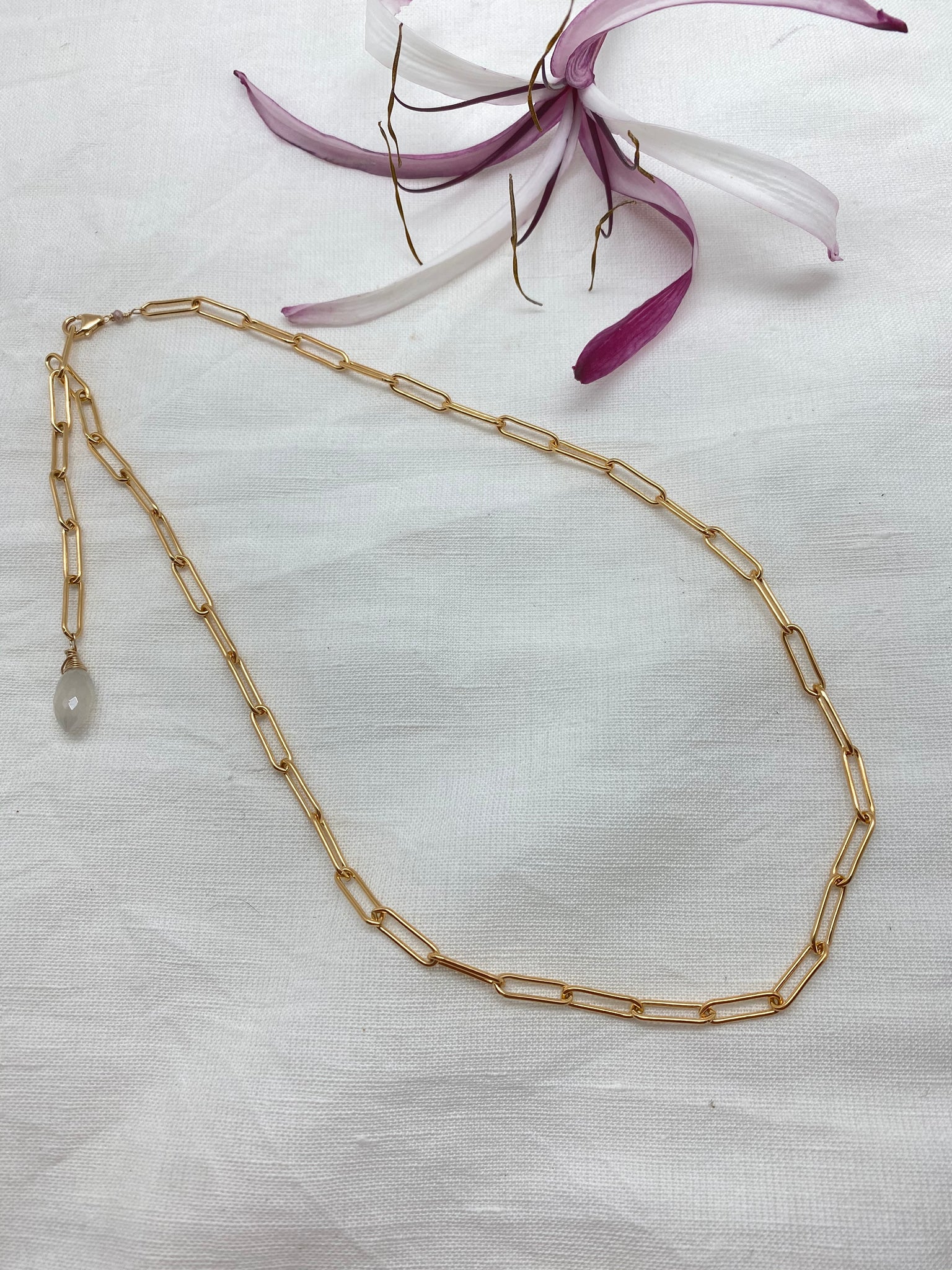 simple paperclip chain necklace with moonstone at the end.